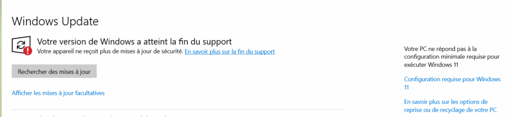 Toutefois, si le lien « S’inscrire maintenant » n’apparait toujours pas après 2 ou 3 redémarrages, cliquez sur « En savoir plus sur la fin du support », et tout en bas d’une page qui vous vante Windows 11, vous trouverez un lien « Obtenir la prolongation des mises à jour de sécurité » qui vous conduira aussi au début de l’inscription si vos mises à jour sont suffisantes.