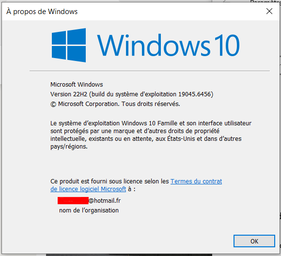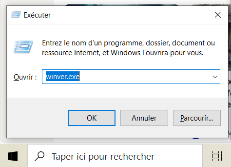 Faites Win+R (Appui sur la touche windows et la lettre R) pour ouvrir la fenêtre « Exécuter » , et tapez « winver.exe » dans la zone de saisie de cette fenêtre, vous obtenez :