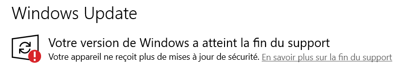 Comme annoncé depuis longtemps, Microsoft a « cessé » depuis le 14 octobre 2025 le support de Windows 10, et le confirme en termes très laconiques sur la page de Windows Update :