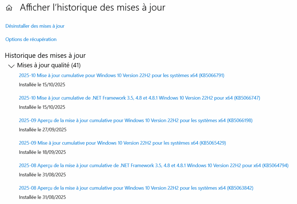 Le process de mise à jour vous demandera peut être des redémarrages : renouvelez la recherche après chaque démarrage, jusqu’à voir l’installation du correctif 2025-10 dans le paragraphe « Mises à jours Qualité » de l’historique des mises à jour (Windows Update ne délivre plus le massage « Vous êtes à jour »)