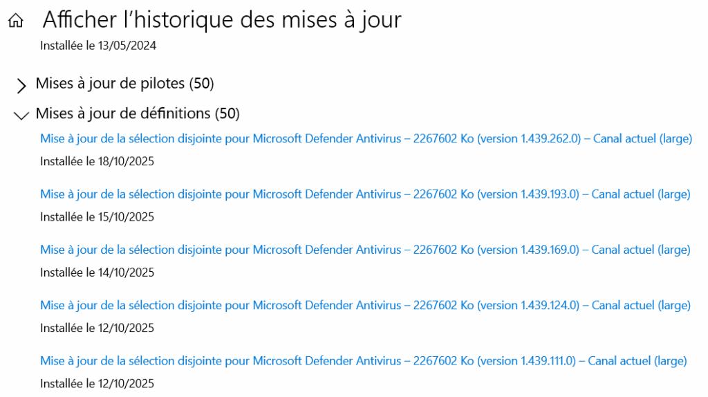 La preuve: on voit dans la liste des « mises à jour de définitions », des mises à jour les 14,15 et 18 octobre.